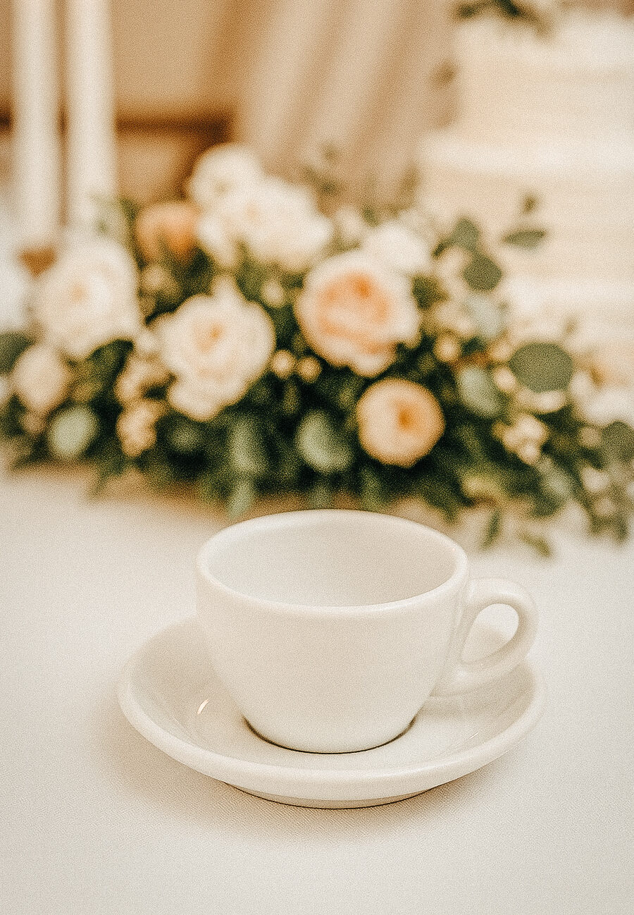 Weiße Porzellantasse (200 ml) – zeitlos, elegant und spülmaschinenfest. Ideal für Hochzeiten, Empfänge und Kaffeebars.